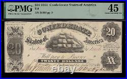 T-9 / PF-12 $20 1861 Confederate Currency CSA Civil War Graded PMG 45